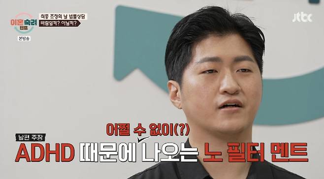 이에 양나래 변호사는 "그런 이야기를 진짜 했냐"면서 "단순히 야동을 보는 것을 넘어서 그런 행동을 하면서 야동을 보면 이혼 사유가 될 수 있다"고 했다.바람 남편은 길 가다가 예쁜 여자가 있으면 쳐다보고 이를 아내한테 이야기 한다고. 남편은 ADHD 때문에 나오는 노 필터 멘트와 반발심 때문이라고 주장했다. 그러나 박민철 변호사는 "잘 안 와 닿는다"면서 "ADHD와 과거사를 핑계로 이야기 한다. 아무 것도 변명이 안된다"면서 변호사 조차 이해하기 힘든 남편의 주장이었다. 이어 변호사는 "나를 설득하려 하거나 방어 하려고 이야기 하면 실제 조정장 가서 방어가 안된다. 변호사가 포기 하면 누구도 편이 없는 거다"고 말했다.