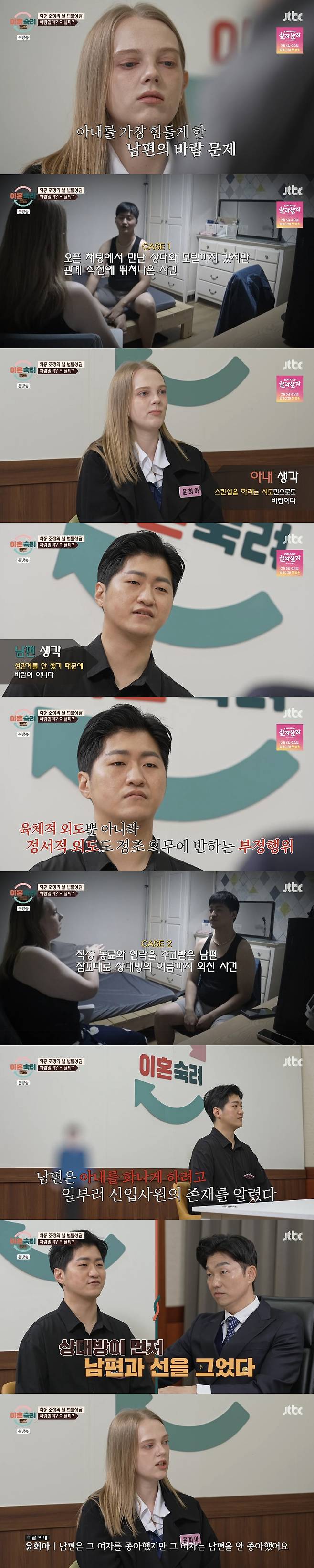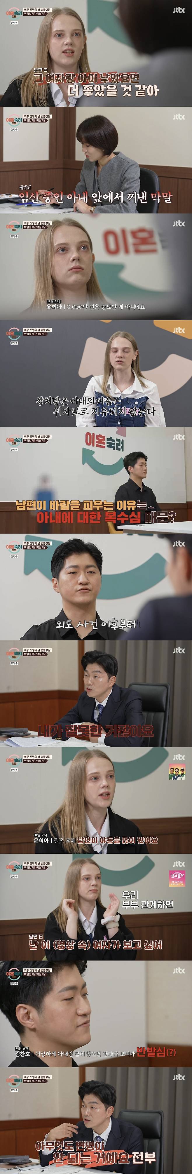 이어 아내 측 양나래 변호사는 위자료 청구가 3,000만원까지 가능하다며 "중요한 건 증거 확보다"며 현실적인 조언을 했다. 그러나 아내는 "돈이 중요한 게 아니다. 그 시간은 다시 돌아오지 않는다. 평생 상처가 있을 것 같다"고 했다.