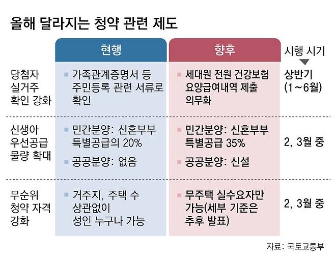 앞으로 민간 분양 아파트에 당첨되면 본인과 가족들의 3년 치 병원 이용 기록을 제출해야 합니다. 국토교통부가 이달 13일 올해 주요 업무 추진계획에서 이런 내용의 부정 청약 근절 방안을 내놓았습니다. 또 신생아 가구를 우선 당첨시키는 특별공급 물량도 늘리기로 했습니다. 이번 주 부동산 빨간펜에서는 올해부터 달라지는 주요 청약 제도를 소개하겠습니다.