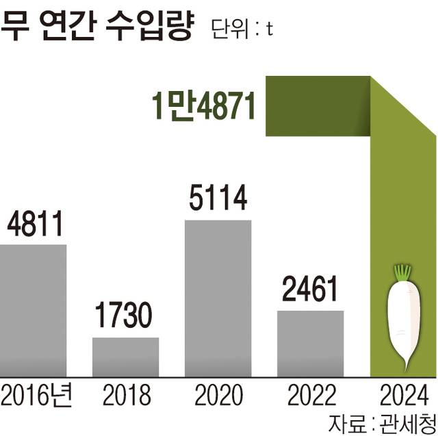 ◆무 수입량 11배 급증…12년 만에 최대치=관세청에 따르면 2024년 1∼12월 수입한 외국산 신선무는 1만4871t으로 집계됐다. 2023년(1307t)과 견줘 11.4배 급증한 것으로 2012년(1만6933t) 이후 12년 만에 최대치다.