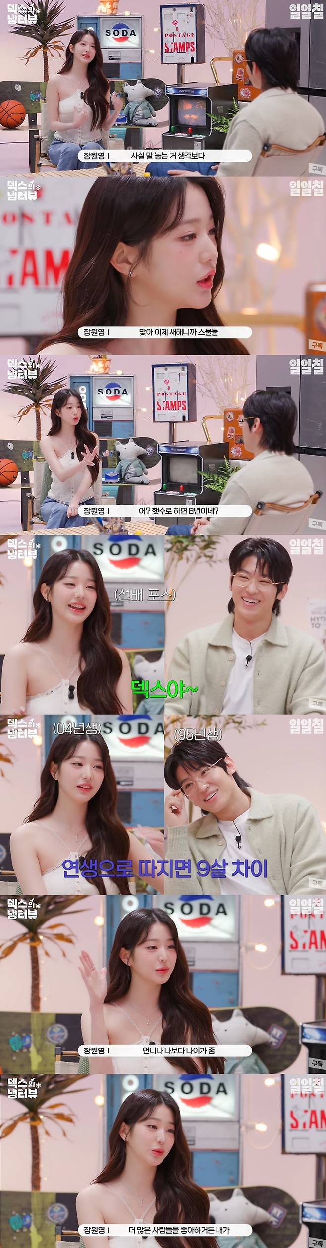 이어 덱스는 반말 모드를 제안했고 장원영은 "사실 말 놓는 거 생각보다 잘한다"고 이야기했다.