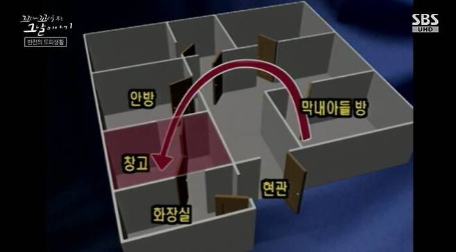 "서울 동대문구 용두동 이근안 씨 집입니다. 이 씨는 주로 현관 오른쪽편 막내아들 방에서 지냈고, 수사관들이 찾아올 때마다 건너편 안방과 통해 있는 창고방으로 피신했습니다. 이 씨는 이 창고 방 안에서 천장과 책꽂이 사이 0.5평 비좁은 공간에 쭈그리고 앉은 채 빈 종이박스를 쓰고 몸을 숨겼습니다. 창고 방은 밖에서 열지 못하도록 잠금장치가 돼 있고, 유사시 도주할 수 있도록 밖으로 통하는 화장실과 연결돼 있습니다. 또 초인종을 눌렀을 경우 누군지 알 수 있도록 현관엔 비디오폰이 설치돼 있습니다."