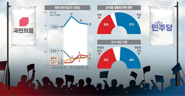 최근 여론조사에서도 보수 결집이 두드러지고 있다. 전날 발표된 1월 3주차(13~15일) 전국지표조사(표본오차는 95% 신뢰수준에 ±3.1%포인트)에서 ‘정권 재창출’은 41%, ‘정권 교체’는 48%로 갤럽 조사와 비슷한 수치로 집계됐다. 1월 2주(6∼8일)차 조사에서는 각각 53%, 37%로 16%포인트 차이가 났지만 일주일 만에 7%포인트 차로 줄어든 것이다.