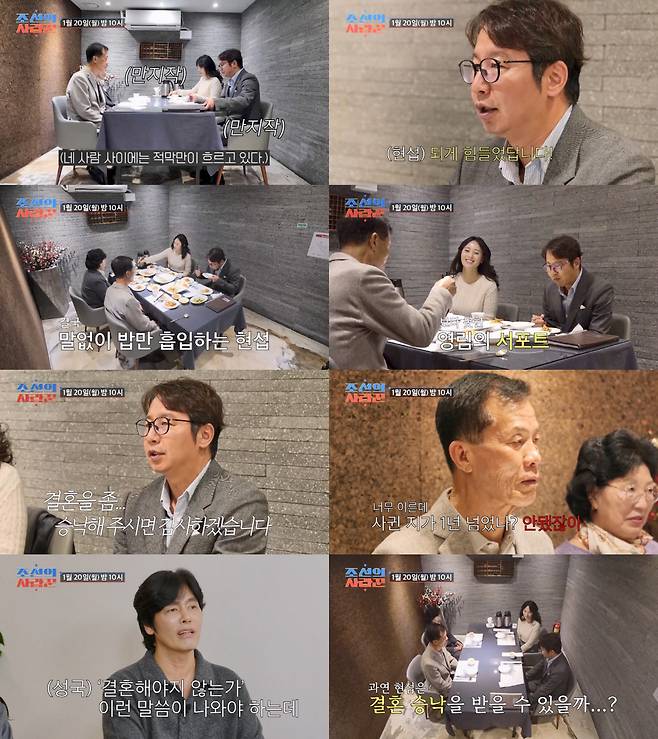 20일 방송될 '조선의 사랑꾼'에서는 재결합에 성공한 심현섭이 여자친구 정영림과의 결혼 승낙을 받기 위해 나선다. 심현섭은 어렵게 여자친구의 부모님과 함께 만났지만, 네 사람 사이에는 적막만이 흘렀다. 심현섭은 "오늘 친구들과 지인들한테 여자친구 부모님 뵈러 간다고 이야기했다"며 운을 뗐다. 그는 "친구들이 되게 힘들었답니다"라고 너스레를 떨며 분위기를 풀어보려고 노력했다.