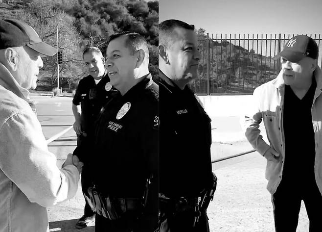 영상 속엔 브루스 윌리스가 모자를 쓰고 로스앤젤레스 경찰들과 악수하고 사진을 찍기 위해 포즈를 취하는 모습이 담겼다.