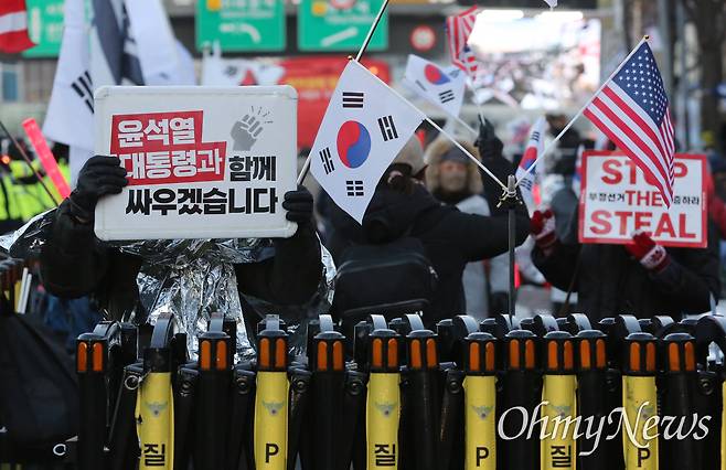 | ▲ 내란 우두머리 혐의를 받고 있는 윤석열 대통령에 대한 고위공직자범죄수사처와 국가수사본부의 2차 체포영장 집행 중인 15일 오전 서울 용산구 대통령 관저 인근에서 보수단체 집회 참석자들이 윤석열 대통령 체포를 반대하고 있다. |