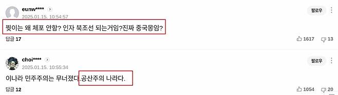 '진짜 내란 수괴는 드럼통 리짜이밍이다 1찍이들아', '진짜 내란을 일으킨 주범 집단과 나라를 혼란케 만든 잡범 찢과 그 개들을 꼭 처단해 주길 바랍니다', '온 국가기관에 범죄당 쁘락치와 간첩들 우글대니', '좌북비씨 그만해라', '내란수괴 민주당과 찢재명을 엄벌하라', '다급한 건 더불어공산당 아니냐'