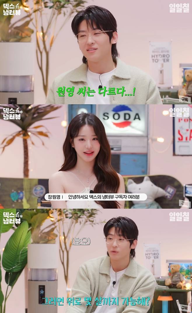 덱스가 "그러면 위로 몇 살 까지 가능하냐"고 돌직구 질문을 던지자 장원영은 "이 질문도 진짜 재밌다"며 차분히 말을 이어갔다.