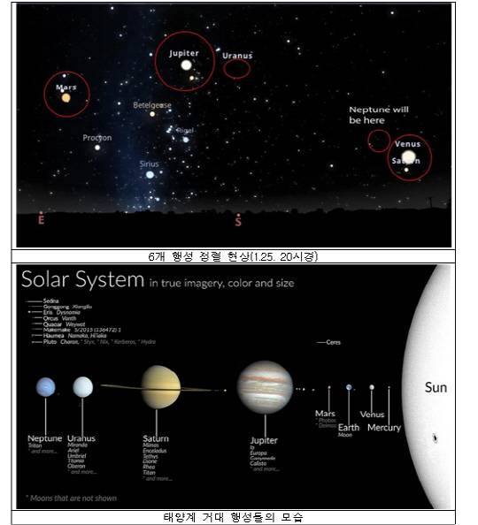 이번 행성 정렬은 태양보다 앞서 지는 수성과 우리가 발을 딛고 있는 지구를 제외한 금성, 화성, 목성, 토성, 천왕성, 해왕성 등 태양계 행성들이 동시에 밤하늘에 떠 있는 현상이다. 전 세계적으로 1월 21일 전후 여러 날에 걸쳐 일어난다. 여러 개의 행성을 한 번에 관찰할 수 있는 행성 정렬은 해마다 볼 수 없다. 특히 이번처럼 6개의 행성이 한 하늘에 모습을 보이는 현상은 흔하지 않다.