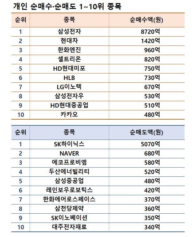 이번 주 개인 순매수 1위 종목은 삼성전자였다. 2~10위는 현대차, 한화엔진, 셀트리온, HD현대미포, HLB, LG이노텍, 삼성전자우, HD현대중공업, 카카오였다. 개인이 가장 많이 매도한 10개 종목은 SK하이닉스, NAVER, 에코프로비엠, 두산에너빌리티, 삼성중공업, 레인보우로보틱스, 한화에어로스페이스, 삼천당제약, SK이노베이션, 대주전자재료였다.
