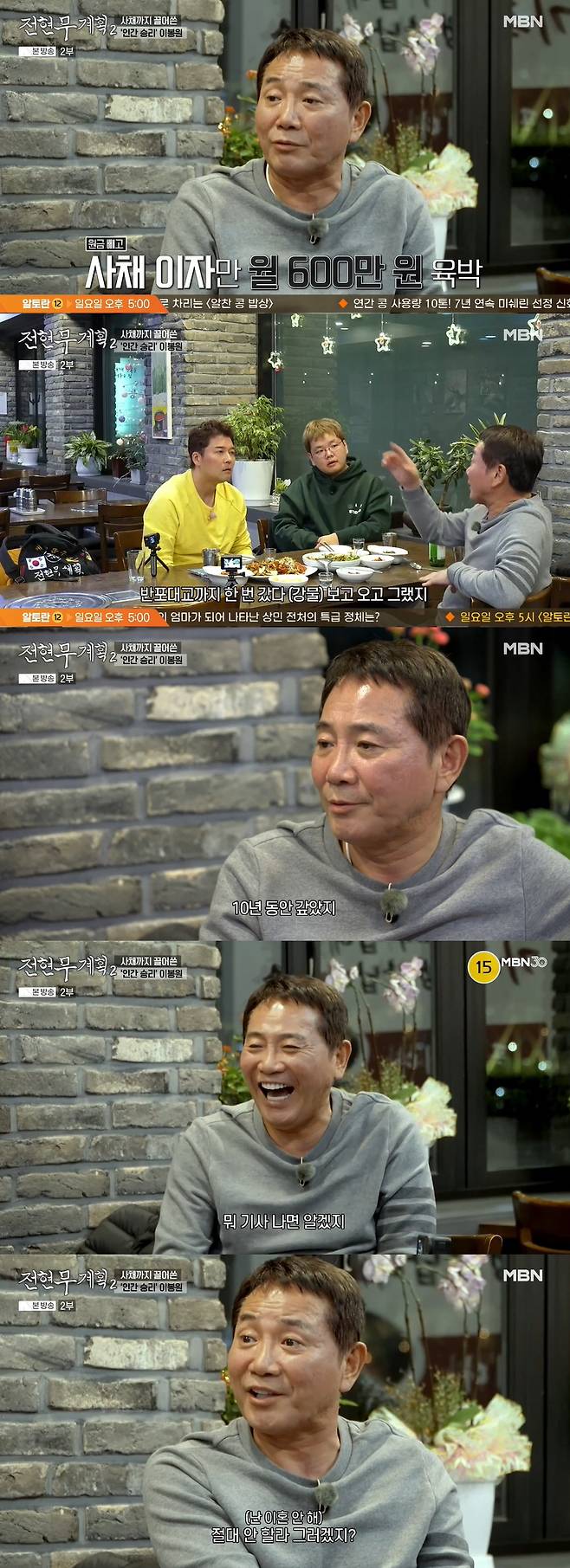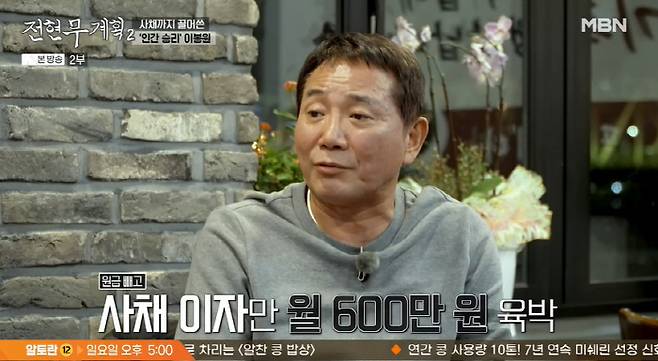 한편 전현무는 "형님이 당당하게 얘기하지만 사업 망했을 때는 많이 힘들지 않았냐. 갚아야 할 돈도 있고"라고 조심스럽게 물었다. 이봉원은 "난 은행 빚이 아니라 사채를 많이 썼다. 이자가 한 달에 월 600만 원씩 나갔다. 2푼이었다"고 털어놨고, 전현무는 "20%면 살벌한 거다"라며 높은 이자에 경악했다.