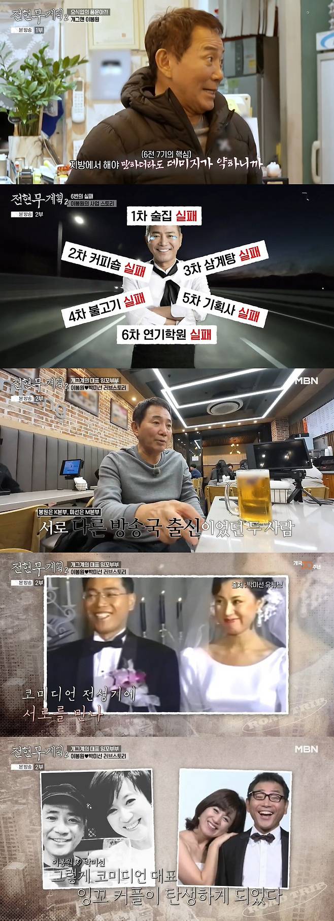 사업을 총 몇 개나 했냐는 질문에는 "남들이 7전 8기라고 하는데 확실한 건 난 6전 7기"라며 "맨 처음에는 결혼하기 전에 단란주점을 했다. 근데 한 달 되니까 심야영업 규제를 해서 망했다. 결혼하고 난 다음에는 백화점 커피숍을 했는데 백화점 자체가 안 됐다. 하루 매출이 2만 원이었다. 아는 형님이 (연결)해 준 건데 내가 잘못 알았다. (소개해 준) 형님이 만회해 주겠다고 백화점 삼계탕집을 분양받았는데 이번엔 백화점이 부도가 났다"고 털어놨다.