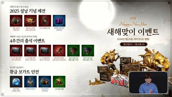 2025 설날 기념 제전, 4주 출석 이벤트, 황금 보가트 던전이 1월 22일부터 2월 26일까지 오픈된다. 또한 헛개수 EX, 커디션 EX와의 컬래버레이션도 진행된다. 컬래버 기간 동안 프라시아 전기 제휴 상품을 구매하면 특별 쿠폰을 획득할 수 있다.