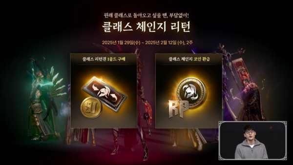 이번에는 클래스 체인지를 진행한 후 만족스럽지 않다면 부담 없이 이전 클래스로 돌아갈 수 있도록 클래스 체인지 리턴도 함께 진행한다. 클래스 리턴권은 1골드에 구매 가능하다. 클래스 리턴권을 구매하면 소모된 클래스 체인지 코인이 환급된다.