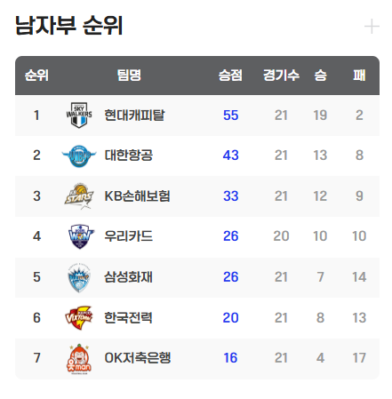 반면, 6위 한국전력은 주포 마테우스의 부상 공백 속에서 4연패에 빠지며 부진을 이어갔다. 한국전력은 1세트에서 대한항공의 범실을 효과적으로 이용해 승리를 가져갔다.