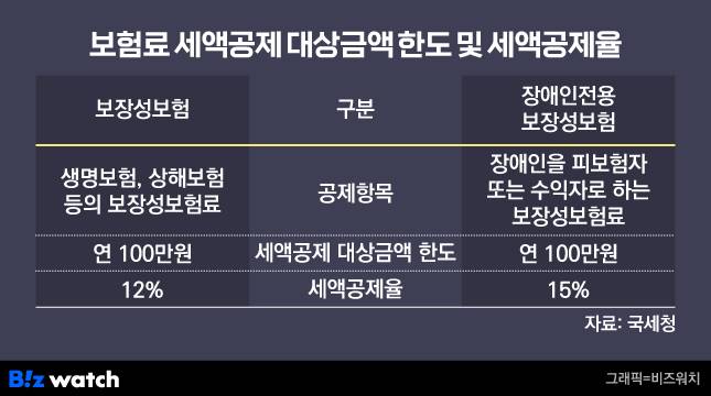 장애인을 피보험자 또는 수익자로 하는 장애인전용 보장성 보험도 공제한도가 연 100만원으로 동일합니다. 다만 장애인전용 보장성 보험은 공제율이 15%입니다.