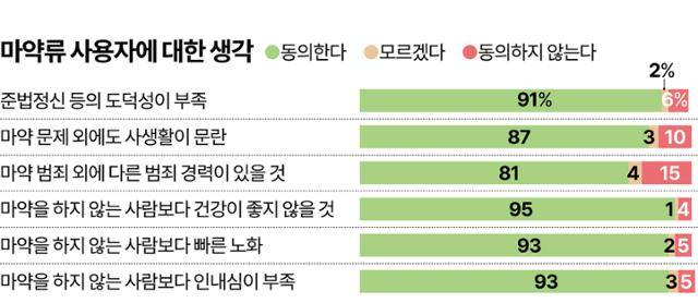 마약류뿐 아니라 마약류 사용자에 대해서도 다양한 측면에서 부정적 인식을 가진 것으로 나타났다. 마약 사용자는 ‘도덕성이 부족하고'(91%), ‘건강 상태가 좋지 않으며'(95%), ‘노화를 빠를 것이고'(93%), ‘인내심이 부족하다'(93%)는 의견에 10명 중 9명 이상이 동의한다. 나아가 마약 사용자는 ‘사생활이 문란하고'(87%), ‘다른 범죄 이력이 있을 것'(81%)이라는 의견에도 10명 중 8명 이상이 동의한다.