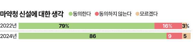 마약 범죄 수사기관을 지휘하는 일종의 컨트롤타워로서 ‘마약청’을 신설해야 한다는 데에는 86%가 동의한다. 이는 2년 전(79%) 대비 7%포인트 상승한 수치로, 마약과 마약 사용자에 대한 부정적 인식뿐만 아니라 마약류 범죄 단속 강화에 대한 요구도 커졌음을 보여준다.