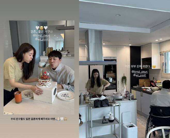 18일 송지은은 지인들이 남긴 게시물을 공유했다. 지인은 송지은과 박위 집에서 음식을 대접받은 모습. 특히 송지은과 박위가 각자의 위치에서 손발을 맞추는 모습을 보며 "이집 부부 진짜 귀엽다"라고 말해 눈길을 끌었다.