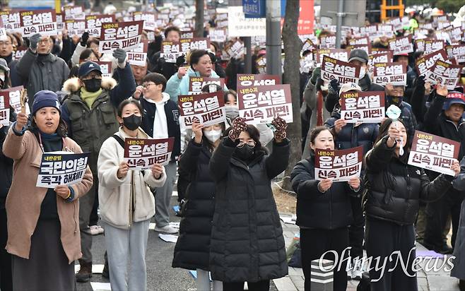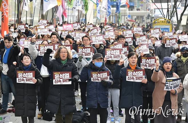 윤석열정권퇴진대전운동본부(이하 대전운동본부)는 18일 오후 대전 서구 둔산동 은하수네거리에서 1500여 명의 시민들이 참여한 가운데 '윤석열 구속 파면! 국민의힘 해체! 사회대개혁! 21차 대전시민대회'를 개최했다.