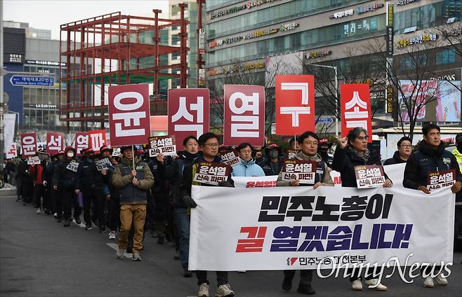 시민대회를 마친 이들은 거리 행진에 나섰다. '반성 없는 내란수괴 윤석열 즉각 구속하라', '불법계엄 내란공범 국민의힘 해체하라'고 쓰인 대형 현수막을 들고, 대형트럭 방송차를 따라 시민들은 은하수네거리에서 방죽네거리를 거쳐 큰마을네거리까지 행진한 뒤, 다시 은하수네거리로 돌아오는 코스로 행진했다.