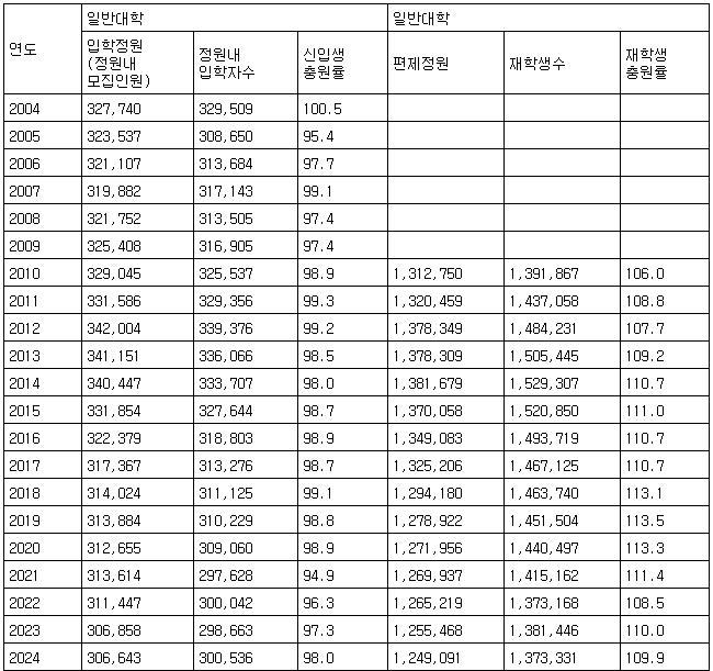 [표] 2004∼2024년 신입생 충원율 및 2010∼2024년 재학생 충원율 (단위: 명, %)