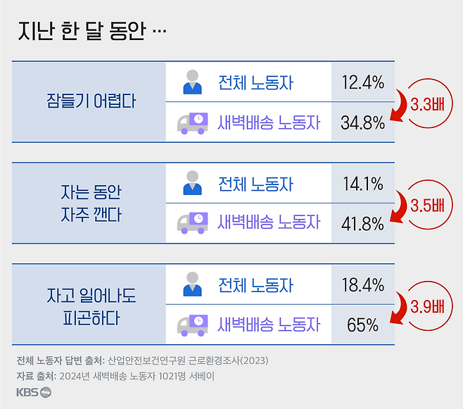 연구팀이 이 세 가지 '수면 장애' 관련 문항 답변을 비교한 결과, 새벽배송 기사 집단에서의 긍정 답변 비율이 전체 노동자 집단(2023년 근로환경조사)보다 3.3~3.9배 높았습니다.