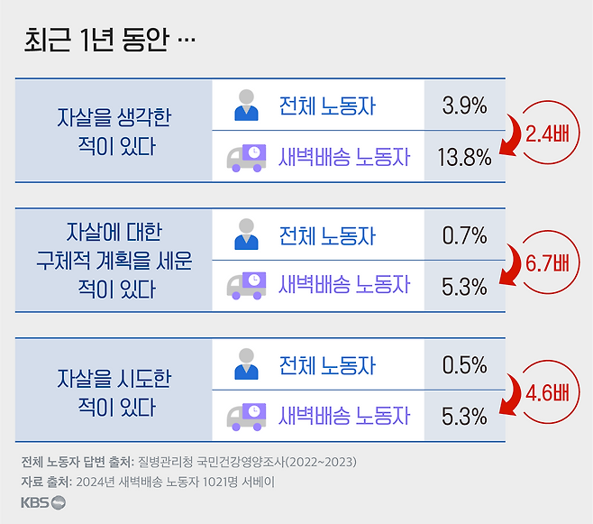 김 교수가 같은 방법으로 비교한 '자살 생각' 관련 답변을 보면, 자살을 시도한 적이 있다고 답한 새벽 배송기사의 비율은 전체 노동자보다 4.6배 높게 나타나는 등 심각한 수준으로 나타났습니다.