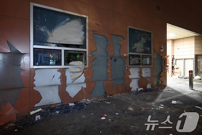 (서울=뉴스1) 민경석 기자 = 19일 새벽 서울 마포구 서울서부지방법원에 윤석열 대통령에 대한 구속영장 발부 소식에 격분한 윤 대통령 지지자들이 난입해 유리창과 법원 건물 벽면 등을 파손한 흔적이 남아 있다. 2025.1.19/뉴스1