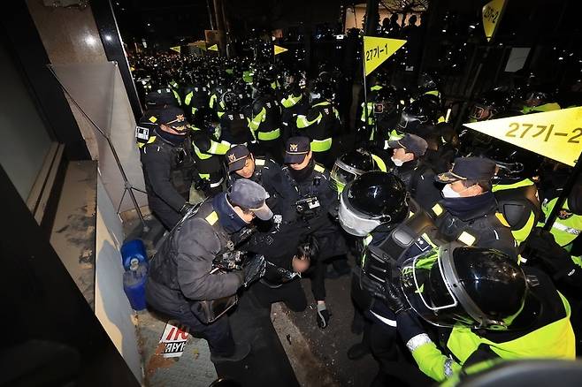 [윤석열 대통령이 내란 우두머리 혐의로 구속되자 지지자들이 서울 마포구 서울서부지방법원에 난입한 19일 오전 서부지법 후문 인근에서 경찰이 시위 중인 윤 대통령 지지자를 끌어내고 있다. (사진=연합뉴스)]