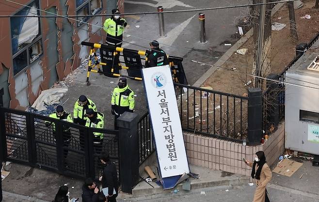 [윤석열 대통령이 내란 우두머리 혐의로 구속되자 일부 윤 대통령 지지자들이 서울서부지방법원 내부로 난입해 불법폭력사태를 일으킨 19일 오후 서부지법 현판이 파손돼 있다. (사진=연합뉴스)]