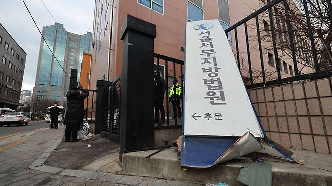 ▲ 일부 윤 대통령 지지자들이 서울서부지방법원 내부로 난입해 불법폭력사태를 일으킨 19일 오전 서부지법 후문 현판이 파손돼있다.