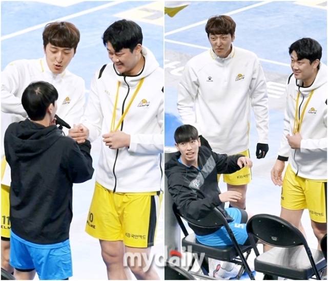 [마이데일리 = 천안(충남) 송일섭 기자] KB 차영석과 나경복이 19일 오후 충청남도 천안시 천안유관순체육관에서 진행된 '2024-2025 프로배구 V리그' 현대캐피탈과 KB손해보험의 경기전 훈련에서 현대캐피탈 박경민과 재미있는 모습을 보이고 있다.