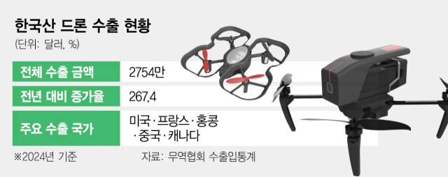 17일 무역협회 수출입통계에 따르면 국내산 드론(무인기)의 해외 수출 규모는 2024년 연간 기준 2754만달러(약 401억 원)로 전년 동기 대비 267.4% 증가했다. 절대 규모 자체는 아직 크지 않지만 드론이 첨단 제품인 만큼 이 같은 수출 성장세는 고무적이라는 평가다.