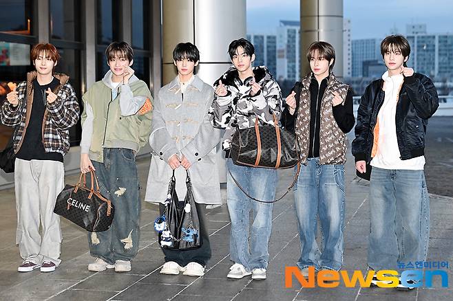 TWS(투어스) 멤버 신유, 도훈, 영재, 한진, 지훈, 경민이 1월 19일 오전 서울 강서구 방화동 김포국제공항 국제선을 통해 중국 베이징으로 출국하고 있다.