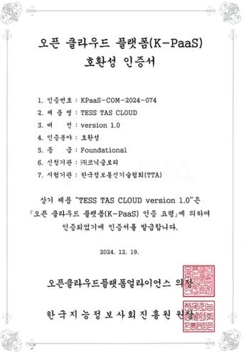 코닉글로리 'TESS TMS Cloud', 오픈 클라우드 플랫폼 얼라이언스(OPA) 'K-PaaS' 호환성 인증 획득