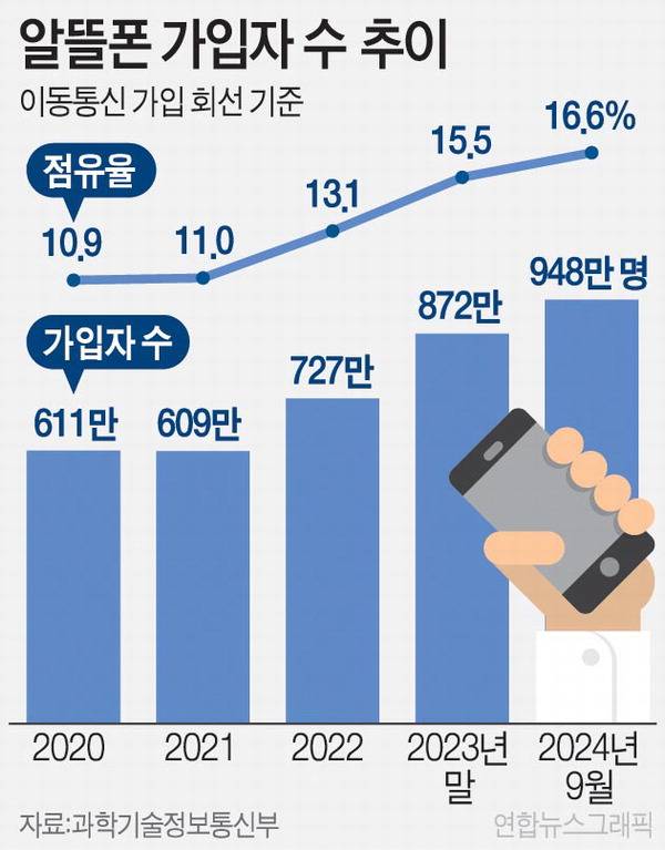 통신망을 확보하지 않은 통신사업자(MVNO)가이동통신사업자(MNO)로부터 망을 빌려서 운영하는 통신 사업의 애칭이다. 단말기(폰) 명칭이 아니다. 정부는 이 제도를 2010년 도입했다. 지난해 9월 기준으로 948만 명이 가입해 있다. 전체 휴대폰 가입자 5698만 명 대비 16.6%이고 통신 품질은 MNO 서비스의 약 99.7%로 측정된다.