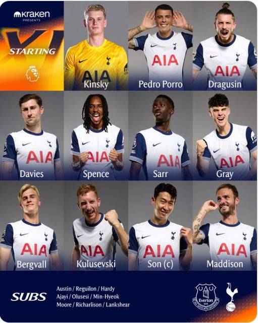 손흥민이 여지없이 선발로 뛴다. 손흥민은 데얀 쿨루세프스키, 제임스 매디슨과 공격진을 형성할 것으로 보인다. 미드필더는 루카스 베리발, 아치 그레이, 파페 마타르 사르다. 수비는 제드 스펜스, 벤 데이비스, 라두 드라구신, 페드로 포로로 구성되고 골키퍼는 안토닌 킨스키일 것으로 보인다.