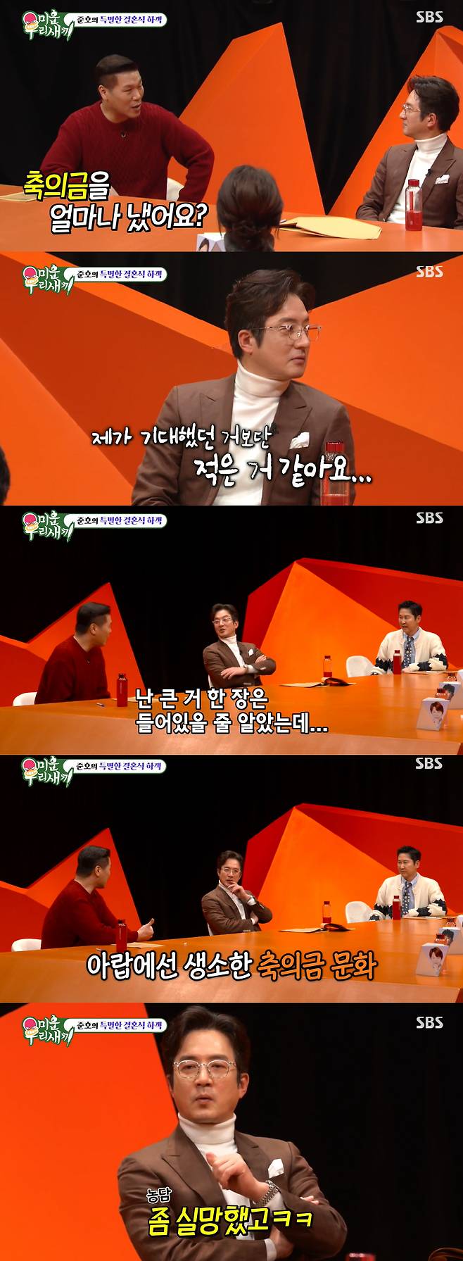 천만원이 아닌 백만원 수준임을 드러낸 것으로 보인다. 서장훈은 "아랍에서는 현찰을 주는 축의금 문화가 없지 않나"라고 물었고, 정준호는 "좀 실망했고"라고 너스레를 떨어 웃음을 안겼다.