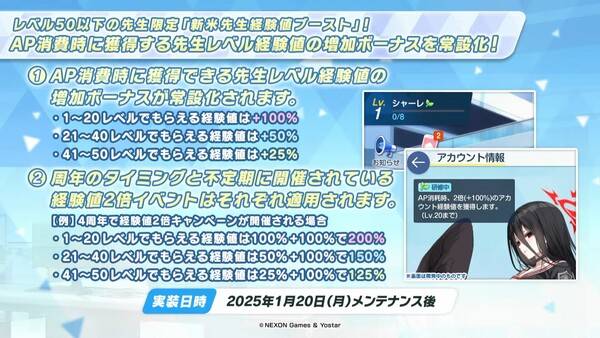 신규 선생님들의 빠른 성장을 돕는 계정 레벨 부스트가 도입된다. 계정 레벨 50 레벨 이하인 선생님들은 AP 소비 시 계정 경험치를 추가로 획득 가능하다. 이는 신규 선생님들이 기존 선생님들을 빠르게 따라잡기 위한 조치다.