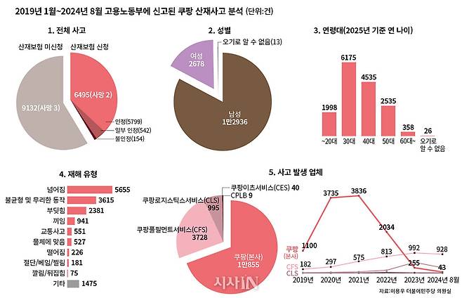 2019년 1월에서 2024년 8월까지 쿠팡 본사와 쿠팡 자회사들인 쿠팡풀필먼트서비스(CFS, 물류)·쿠팡로지스틱스서비스(CLS, 배송)·쿠팡이츠서비스(CES, 음식 배달)·CPLB(쿠팡 자체 브랜드 상품)에서 직접고용한 인력 중 고용노동부에 신고된 전체 산재 건수는 1만5627건이었다. 이 중에서 사고를 당한 노동자가 근로복지공단에 요양급여를 신청한 건수는 6495건, 즉 41.6%에 불과했다. 전체 산재 사건 중 5건은 사망사고였다. 이 중 단 두 건만 유가족이 공단에 산재보험을 신청해 승인을 받았다.