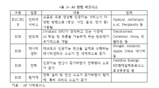 AI 산업의 인프라에 해당하는 전력은 인공지능 연산이 증가하면서 수요도 급증했다. 데이터센터에서는 인공지능 연산을 수행하기 위한 반도체의 전원 공급뿐만 아니라 대량의 서버에서 생성되는 열기를 식히기 위한 냉각에도 많은 전력이 소모됐다. 미국에서 신재생에너지 업체인 뉴스케일파워를 비롯한 전력업체의 이익이 증가했고, 한국에서는 관련된 산업인변압기 제조업(HD현대일렉트로닉스, 효성중공업, 제룡전기)의 제품 수요가 증가했다.