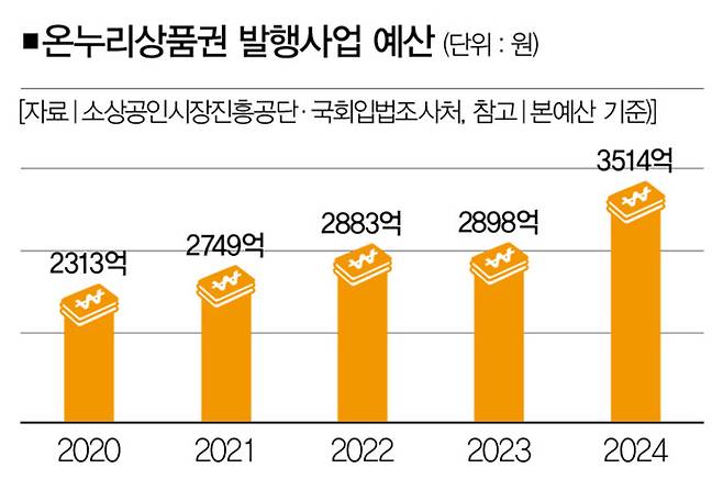 실제로 온누리상품권 발행사업 예산은 2019년 1772억원(본예산 기준)에서 2024년 3514억원으로 두배가량 늘었다. 판매액 목표치가 2019년 2조원에서 2024년 5조원으로 늘어났기 때문이다.[※참고: 3514억원의 예산 중 온누리상품권 발행ㆍ운영사업자에게 지급하는 수수료 예산만 해도 601억2000만원이다. 지난해 12월 산업통상자원부가 밝힌 2023년 기준 국내 중견기업의 평균 매출이 1677억원이었던 걸 감안하면 결코 적지 않은 액수다.]
