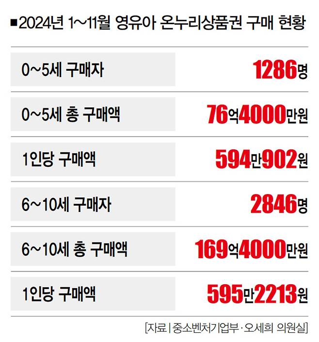 이뿐만이 아니다. 오세희(더불어민주당) 의원실이 중기부로부터 제출받은 '연령별 온누리상품권 구매 현황'에 따르면 지난해(11월 30일 기준) 0~5세 온누리상품권 구매자는 1286명이었고, 구매금액은 76억4000만원에 달했다. 1인당 구매액은 600만원에 육박했다. 온누리상품권 부정유통에 갓난아이까지 동원하고 있다는 얘기다.