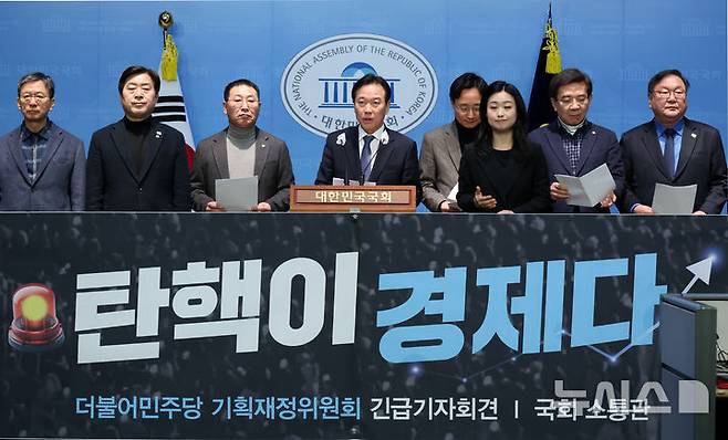[서울=뉴시스] 조성우 기자 = 정태호(왼쪽 네 번째) 더불어민주당 기획재정위원회 간사를 비롯한 의원들이 20일 오전 서울 여의도 국회에서 열린 탄핵 정국 장기화와 한국 경제 위기 관련 기자회견을 하고 있다. 2025.01.20. xconfind@newsis.com