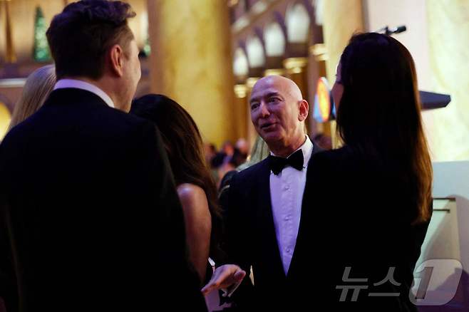 (워싱턴 AFP=뉴스1) 우동명 기자 = 일론 머스크 테슬라 CEO와 제프 베조스 아마존 창업자가 19일(현지시간) 도널드 트럼프 대통령 당선인의 취임을 하루 앞두고 워싱턴 국립 건축 박물관에서 열린 캔들라이트 디너에 참석해 얘기를 하고 있다. 2025.01,20