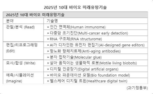 과학기술정보통신부와 한국생명공학연구원(KRIBB)은 20일 바이오 분야의 미래 비전을 제시할 '2025년 10대 바이오 미래유망기술'을 발표했다.