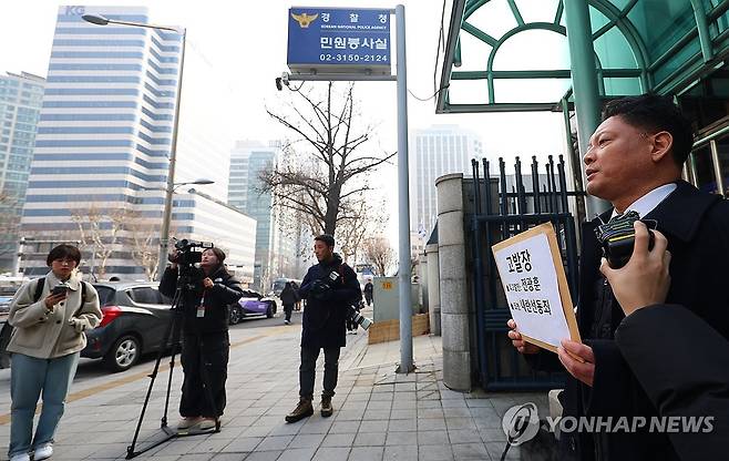 (서울=연합뉴스) 김도훈 기자 = 사법정의바로세우기시민행동 김한메 상임대표가 20일 오후 서울 서대문구 경찰청 국가수사본부 앞에서 사랑제일교회 전광훈 목사에 대한 내란 선동 혐의 고발 기자회견을 하고 있다.