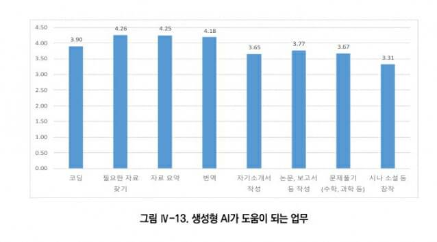 교과 학습을 준비하기 위해 90% 넘는 청소년들이 포털 검색을 이용했으며, 그 다음으로 유튜브, 파파고 순으로 나타났다. 반면 챗GPT와 구글Bard를 이용한 비율은 35% 정도로 가장 낮았다. 청소년들이 생성형 AI가 도움이 된다고 많이 응답한 업무는 필요한 자료 찾기, 자료 요약, 번역, 코딩이었다. 반면 자기소개서 작성, 시나 소설 등 창작, 문제풀기 등의 업무는 상대적으로 낮은 점수를 보였다.