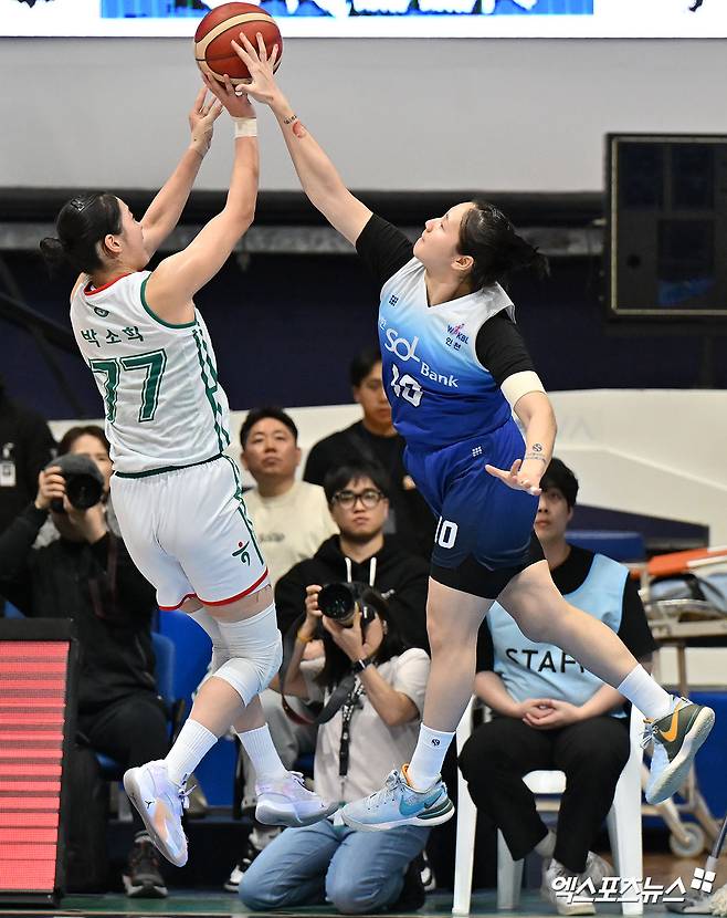 (엑스포츠뉴스 인천, 김한준 기자) 20일 오후 인천광역시 중구 도원체육관에서 열린 '하나은행 2024~2025 여자프로농구' 신한은행과 하나은행의 경기, 신한은행 이두나가 하나은행 박소희의 점프슛을 블락하고 있다.